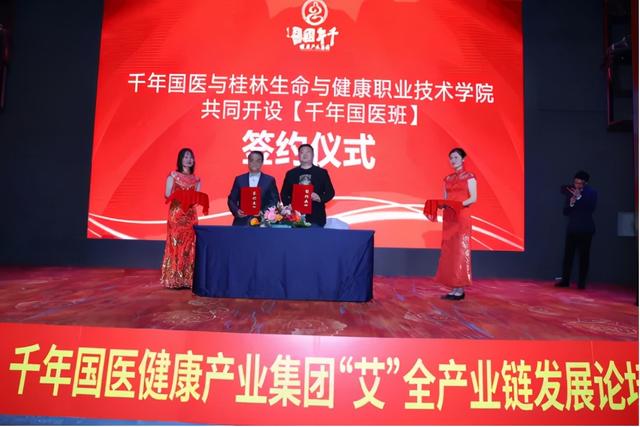 最后,千年国医健康产业集团与桂林生命与健康职业技术学院联合开设的【千年国医班】签约仪式也在此次论坛中顺利举行。桂林生命与健康职业技术学院副校长许有旁、千年国医健康产业集团董事长张季冬共同签约并交换签约证书。